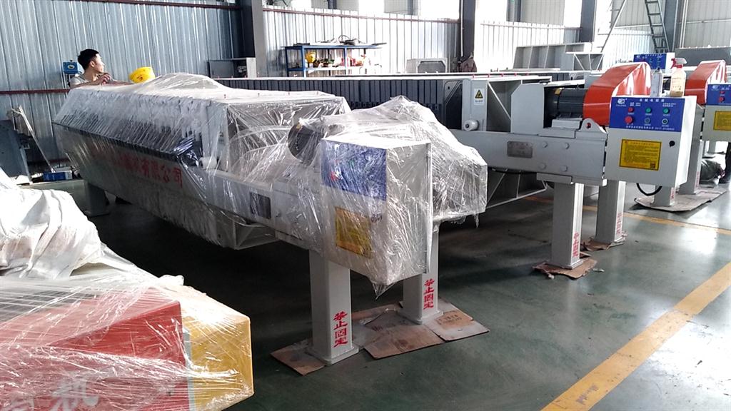 (2)關閉吹氣閥,打開出液閥,打開1/4進料閥,打開進料泵,觀察物料壓力波動。如果壓力較大,則需要調整回油管上的閥門。考慮到濾布的毛細效應,濾液在壓榨初期通常是渾濁的,運行幾分鐘后逐漸恢復清澈。逐漸打開進料閥,同時打開溢流閥。當進料壓力達到設定壓力且濾液流量變小時,進料結束。然后打開進氣閥,將空氣泵入壓濾機隔膜板的腔室。空氣壓力小于設定壓力。加壓過濾時間通常為1-3分鐘。當觀察到濾液流出一小段時間時,停止進氣口,打開泄壓閥,排出隔膜室中的氣體。打開進料口的中間吹風閥(位于壓板上),使空氣高速通過,以除去水分。